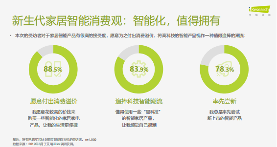 新生代家居智能消费观会更偏向智能化,本次的受访者对于家居智能产品有很高的接受度,愿意为之付出消费溢价,将高科技的智能产品视作一种值得追捧的潮流。