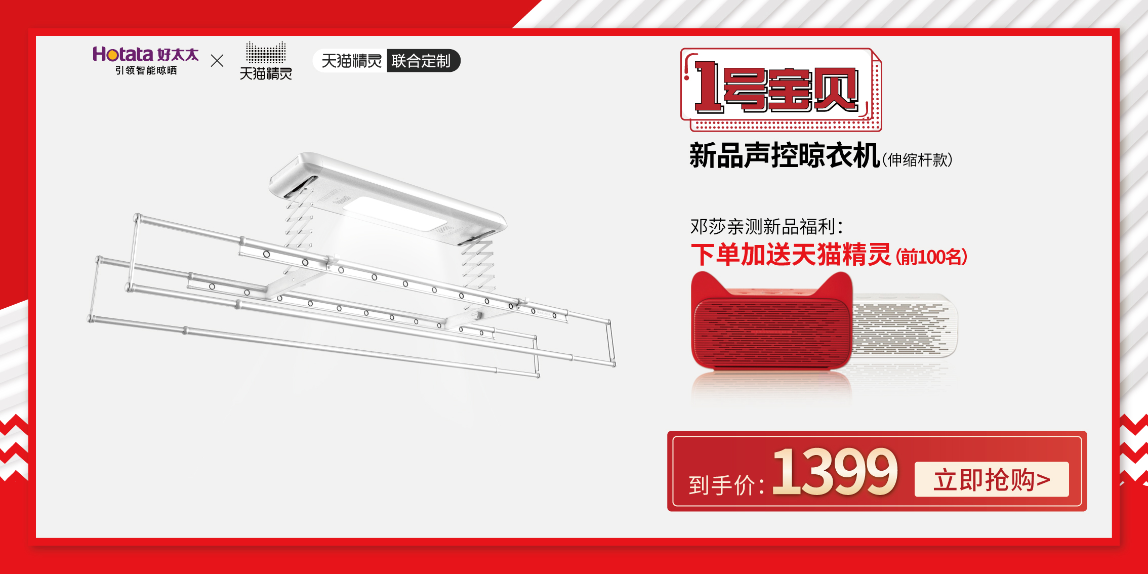 当乐鱼与天猫精灵强强联合,会为智能家居碰撞出怎样的新火花呢?让莎莎在直播间现场为大家亲测这款新品声控晾衣机,一起来八卦莎莎生活中都在用哪些好用的智能单品,一起get同款!直播现场下单邓莎亲测款新品声控晾衣机,还可以加送天猫精灵哦~